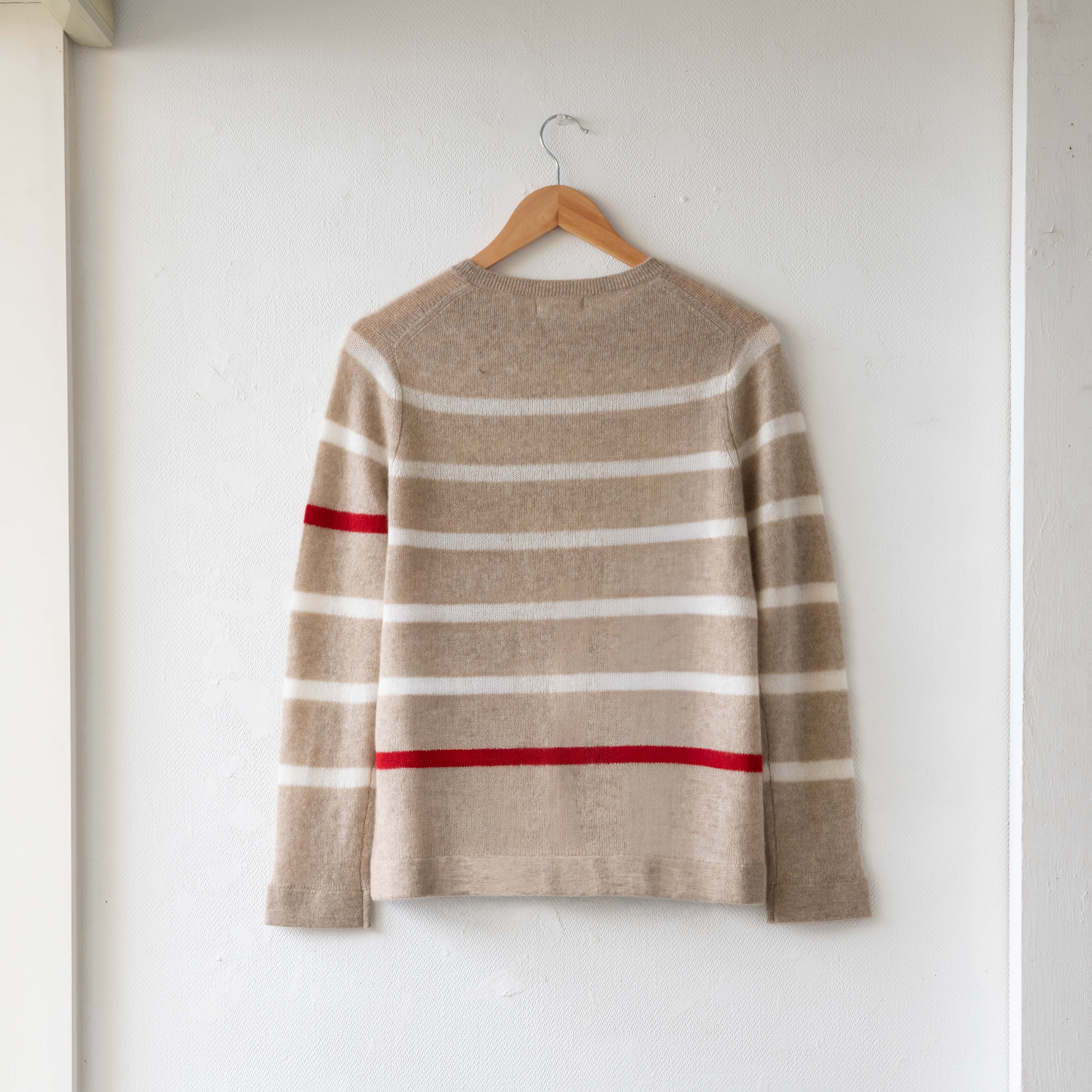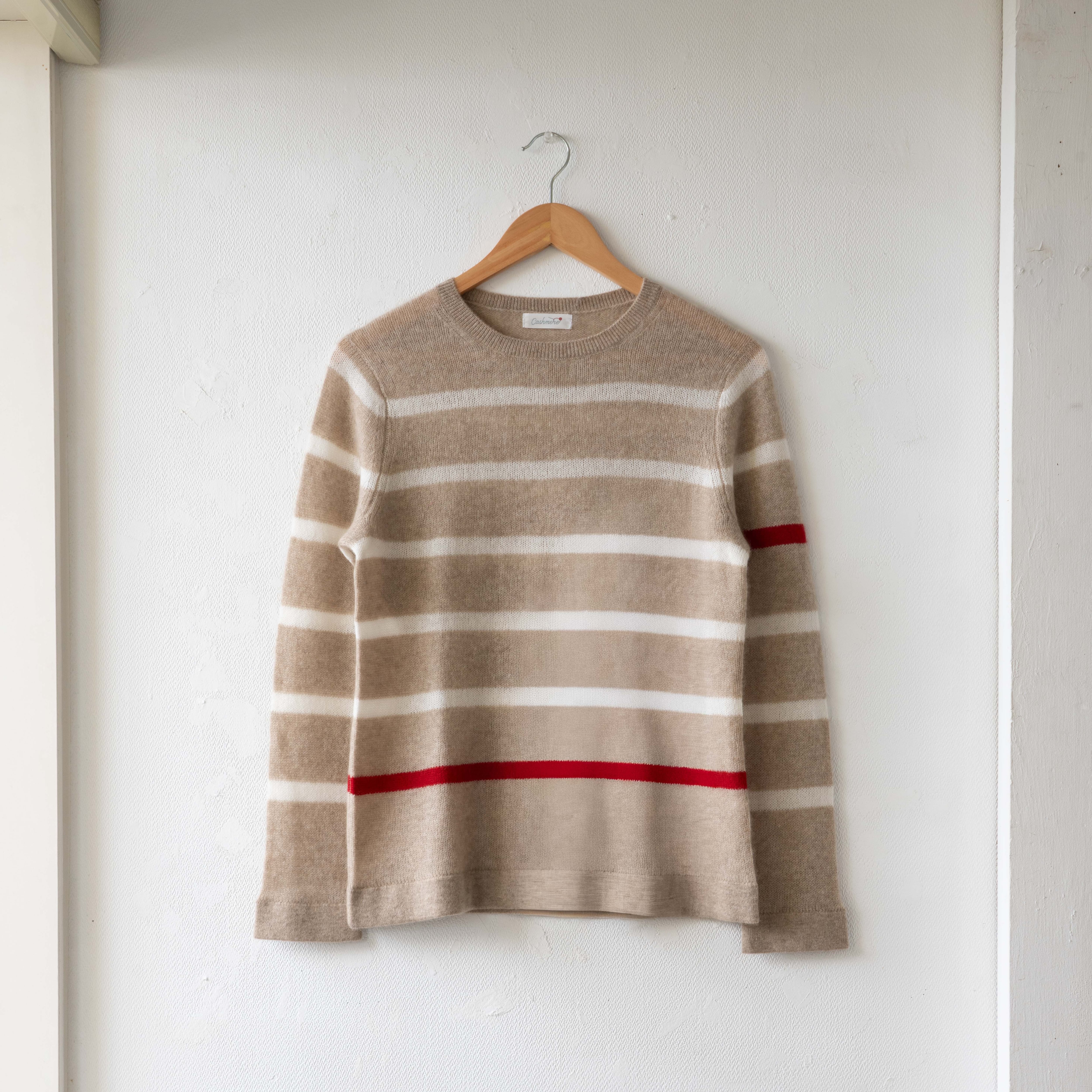 ✴SALE理由✴ 生産終了アイテム/残りわずか 来季はボーダーのピッチを変えて、リモデル予定です。 一本だけ入ったポイントカラーが、 アクセントに。 シンプルながら、さりげなく個性が際立つ一枚です。 このデザインでのご案内は、今回限りとなります。 サイズ(単位㎝):身丈60、身幅48、肩幅37、袖丈56 (ニット製品の為、多少のサイズ差がございます) 素材:カシミヤ100% 原産国:モンゴル それぞれに理由のある、特別な一枚を揃えました。 お気に入りを見つけていただけたら嬉しいです。
