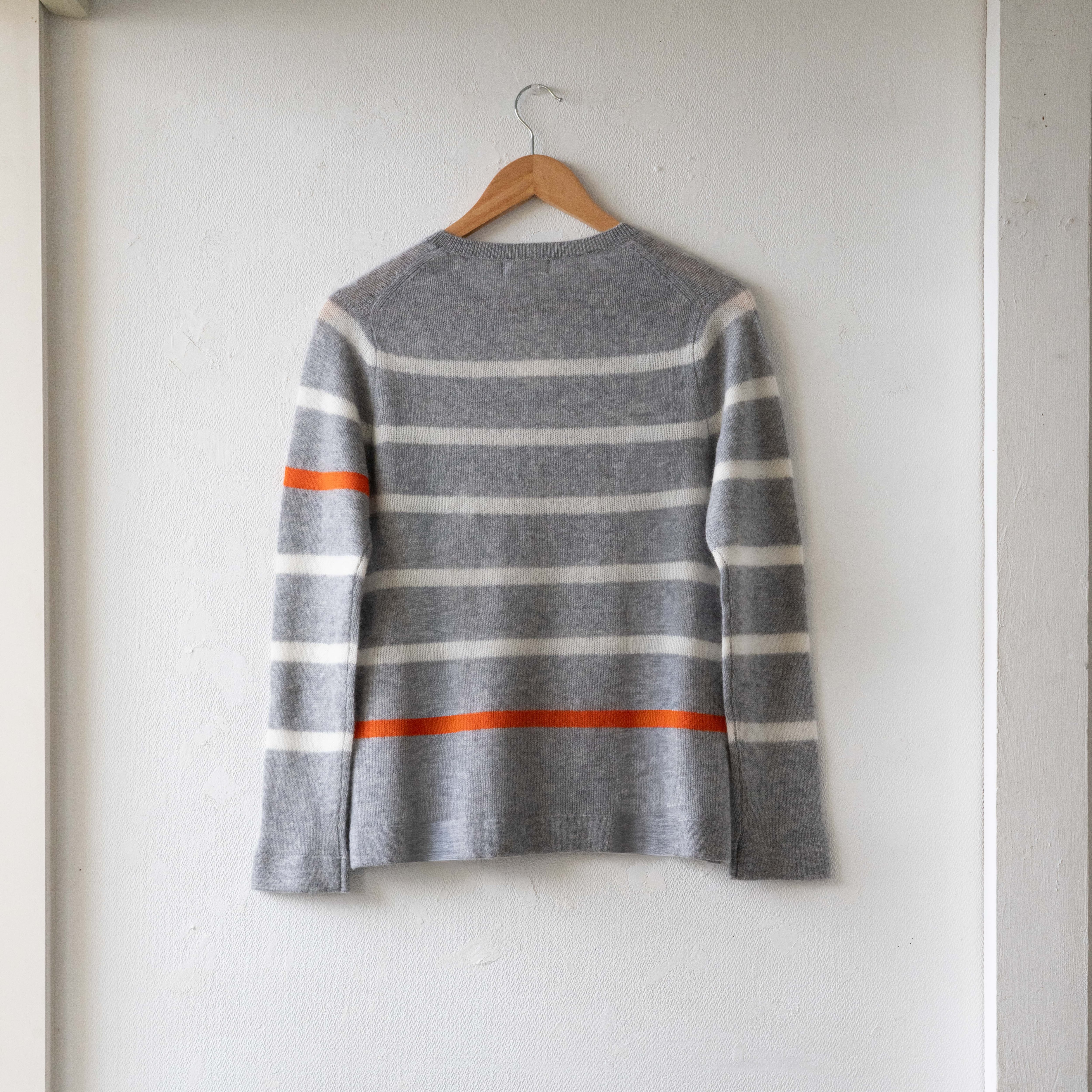 ✴SALE理由✴ 生産終了アイテム/残りわずか 来季はボーダーのピッチを変えて、リモデル予定です。 一本だけ入ったポイントカラーが、 さりげないアクセントに。 シンプルながら、さりげなく個性が際立つ一枚です。 このデザインでのご案内は、今回限りとなります。 サイズ(単位㎝):身丈60、身幅48、肩幅37、袖丈56 (ニット製品の為、多少のサイズ差がございます) 素材:カシミヤ100% 原産国:モンゴル それぞれに理由のある、特別な一枚を揃えました。 お気に入りを見つけていただけたら嬉しいです。